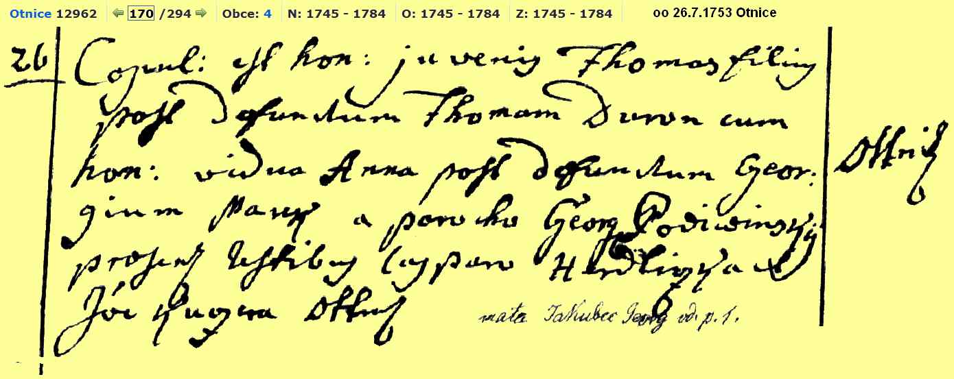 26.7.1753 - sňatek Thomas syn po zemřel. Thomum Duron s vdovou Annou po zemřelém Gerogu Marek (rozená Gerog Jakubec)